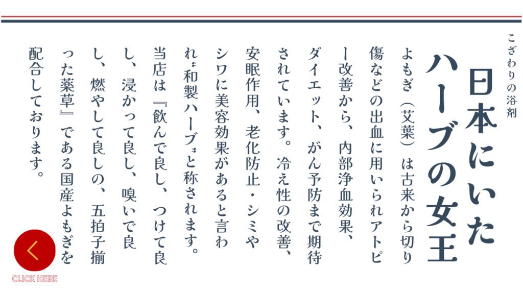 日本産のよもぎと、その他国内にて調達・配合した漢方で、黄土の椅子に座ってご入浴いただきます。