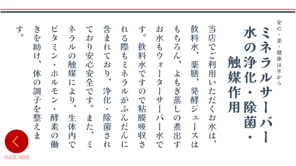 ご入浴いただくお水も鉱物から抽出したミネラルにより生成した、良質なミネラルウォーターにて提供する、当店オリジナルのよもぎ蒸しをお楽しみいただけます。