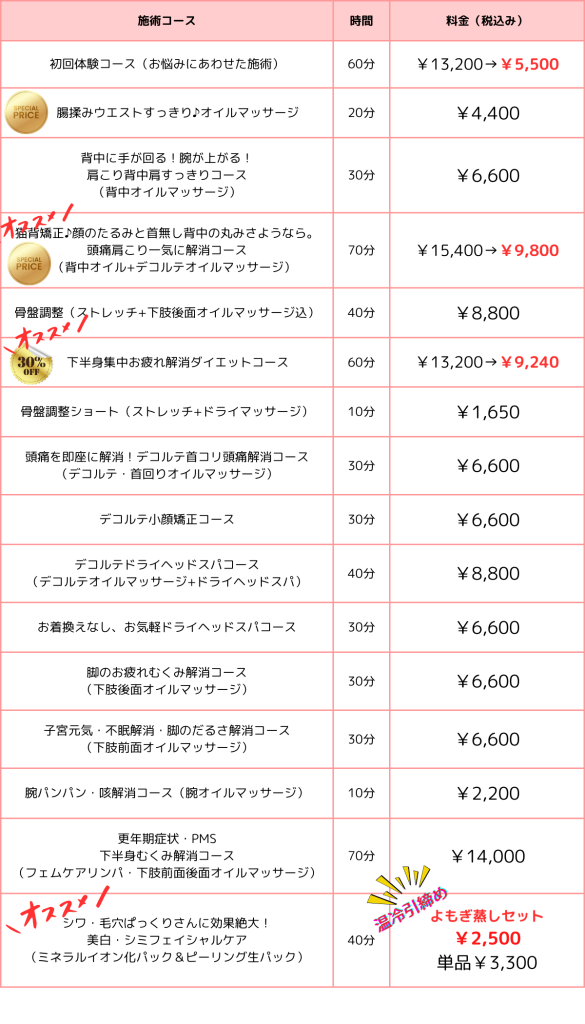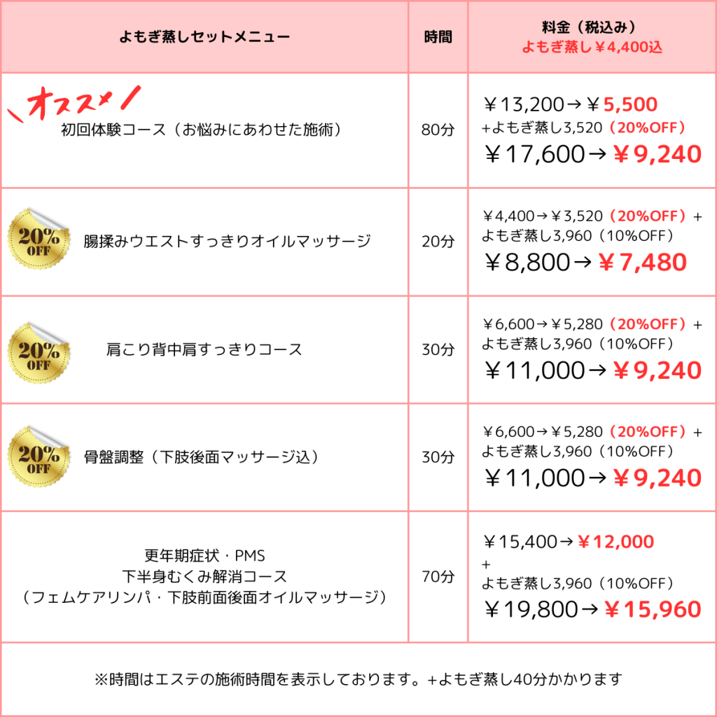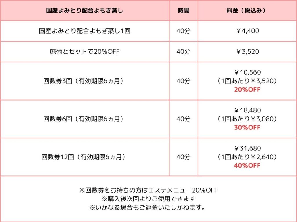 ※よもぎ蒸し回数券をお持ちの方は20%OFF(すでに割引のコースには併用不可です)